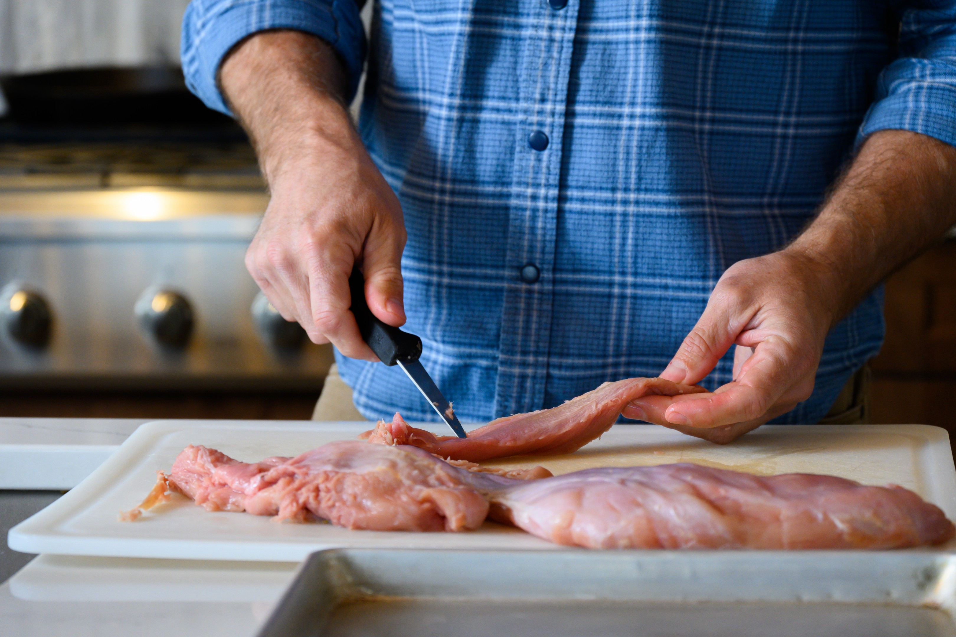 Before you start cutting, take a minute to look at the breast. You'll see different muscle groups separated by visible seams — and running through and between those groups is silver skin. It's the thin, shiny, whitish membrane that doesn't break down when you cook it. That's the chewy part. Your job is to find it, follow it, and get it out without wasting the meat around it.